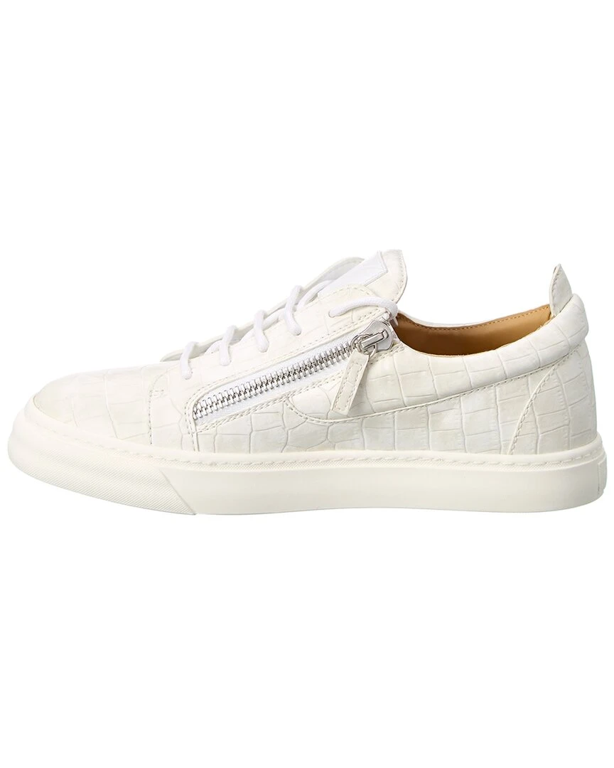 - Kaiman Sneaker in white croc-embossed faux leather and silver-tone hardware with zippered sides