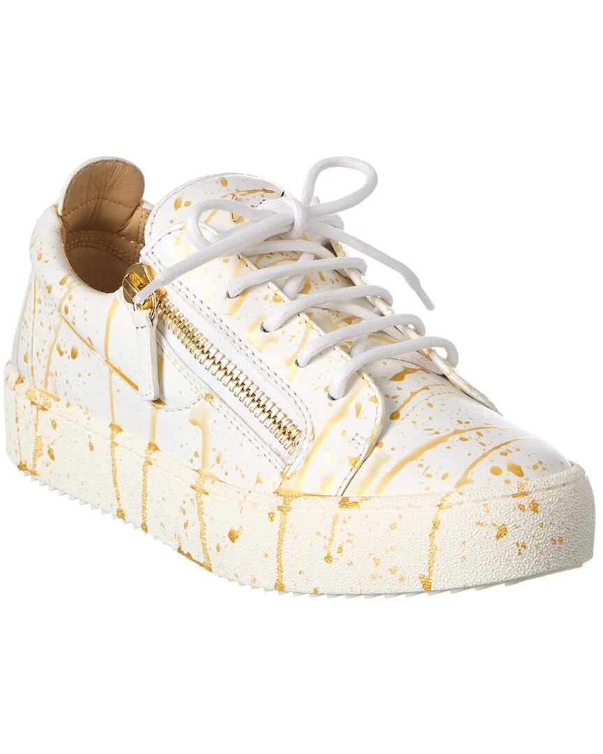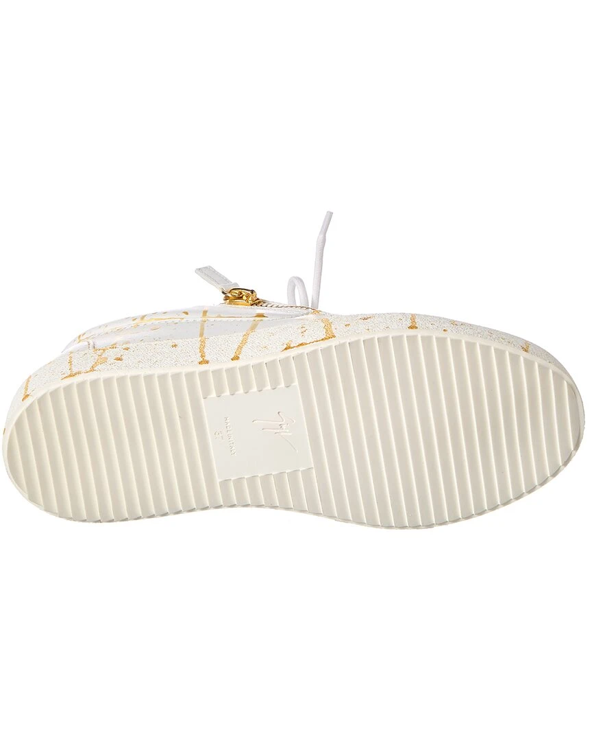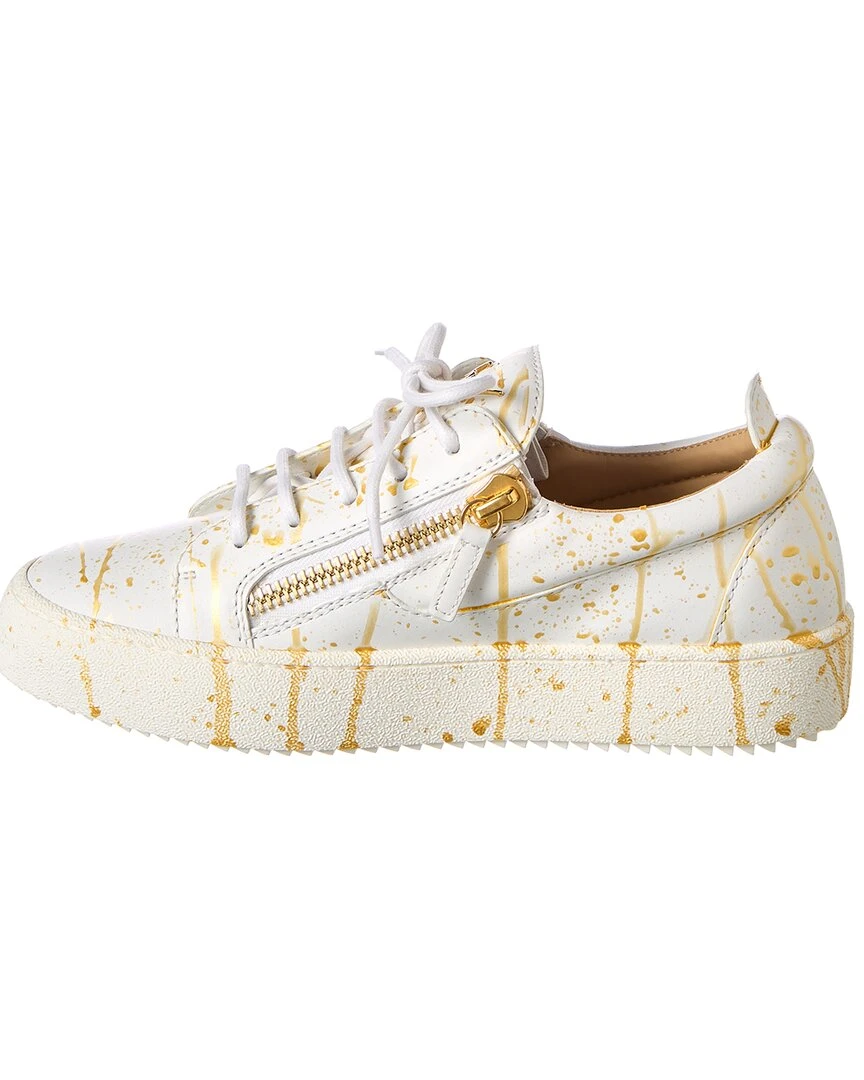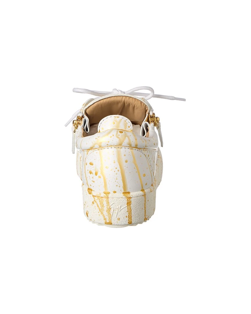 - May London Leather Sneaker in white and gold splatter leather and gold-tone hardware with logo accent and zipper details