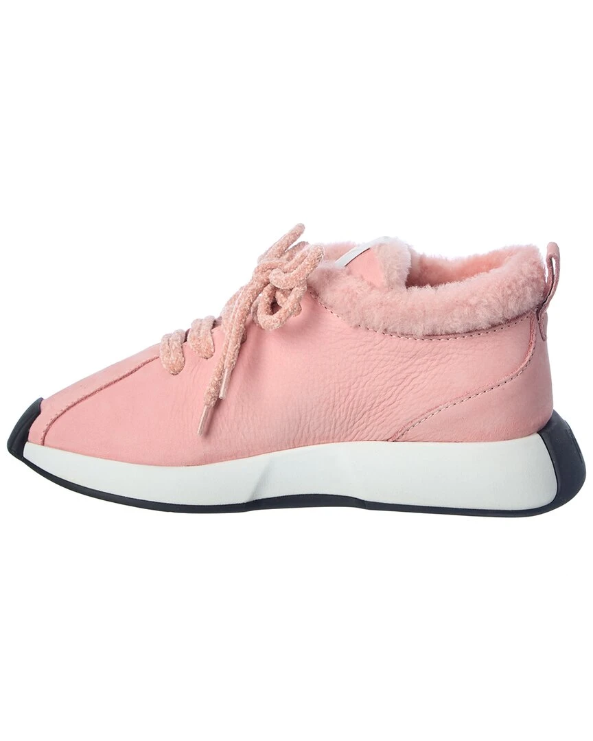 - Omnia Leather & Shearling Sneaker in pink leather and shearling with logo accent and chenille laces