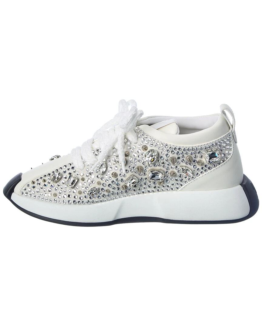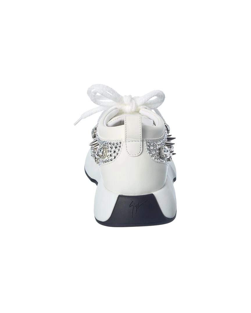- Omnia Suede & Leather Sneaker in white suede and leather and silver-tone hardware with crystal and spike embellishments and chenille laces