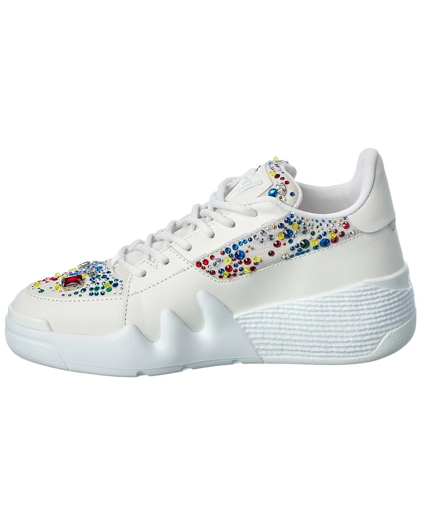 - Talon Leather & Suede Sneaker in white leather and suede and silver-tone hardware with allover crystal embellishments